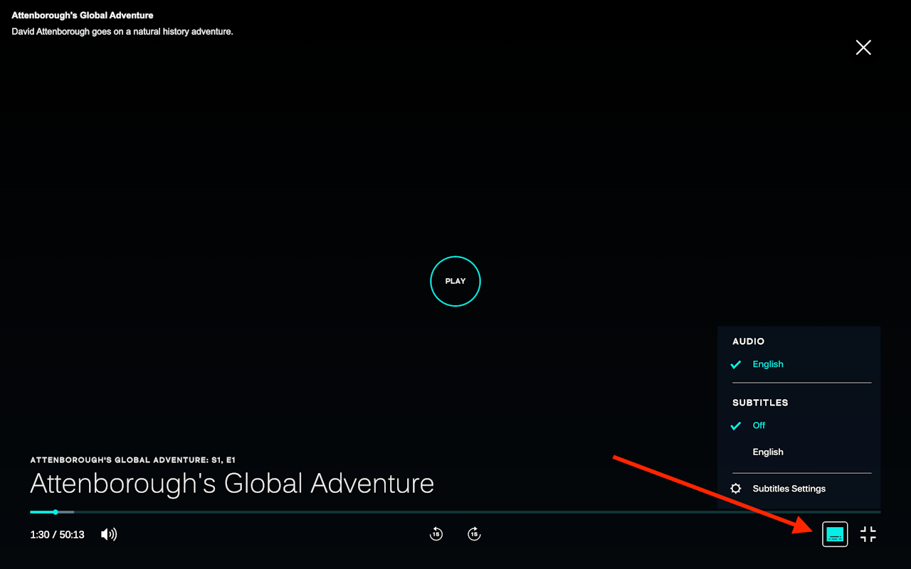 You can turn closed captions on or off by clicking on the caption settings icon in the bottom right corner of the screen.